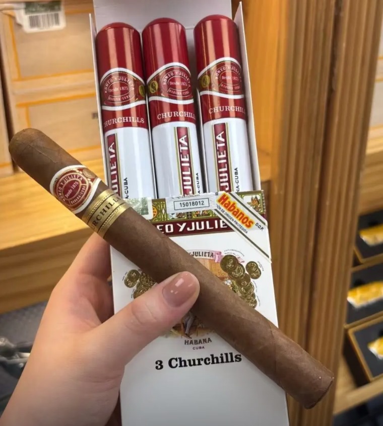 罗密欧与朱丽叶品牌创立于1875年,名字来自莎士比亚的戏剧,丘吉尔系列则是为了纪念英国首相温斯顿·丘吉尔而推出的。我觉得这个品牌很有故事感,雪茄界经典的7英寸×47环径尺寸甚至成了行业标准。烟叶都来自古巴Vuelta Abajo优质产区,采用手工卷制工艺,百年传承下来,定位高端,被称为“绅士风格”的象征。