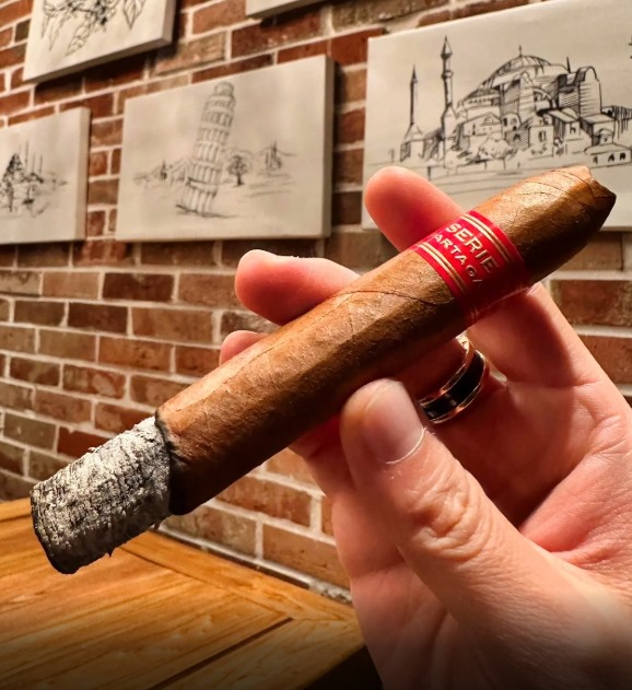 深棕色木盒配金色盾形LOGO很显档次,内衬雪松木条防潮效果不错。限量版更讲究,比如2015年限量版用黑色磨砂木盒配红色金属铭牌,全球只发了5000盒。茄衣深红褐色油润光滑,叶脉纹理细腻,卷得紧实没空洞,红金黑三色标环很有辨识度。