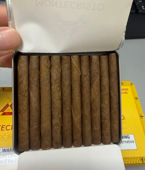 蒙特小雪茄Mini,这款古巴蒙特克里斯托的迷你雪茄,10支装铁盒价格真的很让人心动,一盒大概110元,一条10盒总共100支只要1100元。单支燃烧时间15分钟左右,尺寸小巧便携,用的是100%古巴烟草,在哈瓦那机制生产。对于想快速解瘾或者刚入门的朋友来说,这个价格和规格都挺友好的,我个人觉得性价比不错。