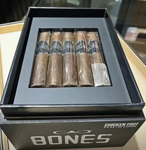 CAO骨牌雪茄的包装设计挺有特色的,以复古多米诺骨牌和骰子为灵感,黑白色调搭配银色金属元素,盒身印着经典骨牌图案和“BONES”字样,整体简洁又带点怀旧感。每盒20支还附赠定制骰子,盒盖内部有绒布衬里,能当游戏托盘用,呼应了“边抽边玩”的主题。我觉得盒子材质厚实,密封性不错,适合长期保存,既有实用性又有收藏价值。