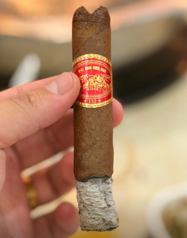 后段长城132记忆雪茄加入饼干味,但烟气烫嘴,全段甜感持续,吃味巧克力加重,焦油积累多,热气严重,体验下降快。