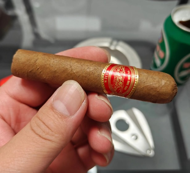 初次开盒,茄衣泛着温润光泽,茄体紧实却富有弹性。铁盒包装采用中国红配色搭配金色LOGO,内置湿度调节片,无需额外保湿盒。茄帽带“小辫子”,方便撕开,细节设计对新手友好。