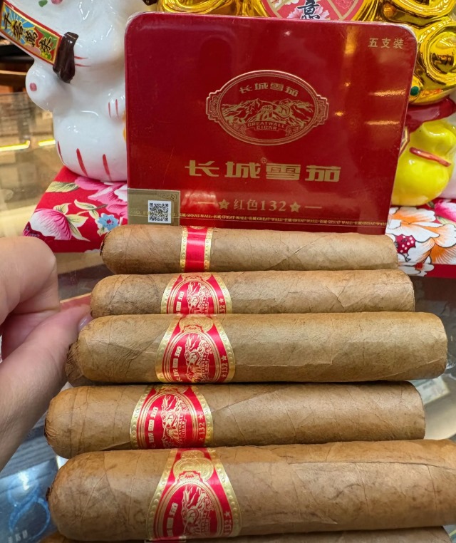 长城红色132雪茄,定价200元/盒(5支),一条4盒,长度90mm,环径43。作为小皇冠尺寸雪茄,整体浓度中低至中等,单支价格约40元,适合新手体验,品吸时长约30分钟。