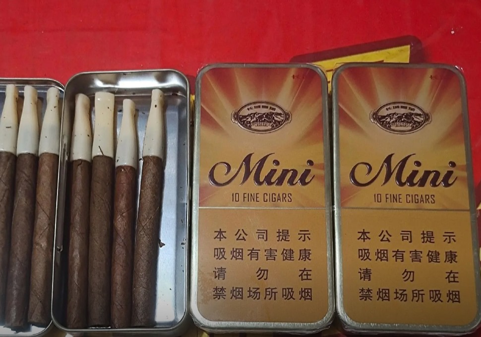 雪茄烟体长约75-100mm,环径26-27mm,属于迷你尺寸。茄体呈深棕色或棕红色,表面光滑紧实,卷制工艺良好。每支配有奶黄色塑料滤嘴,长度约25mm,能防烫手并减少杂质。未点燃时闻起来有木香、坚果香和淡淡花香,烟草气息自然。