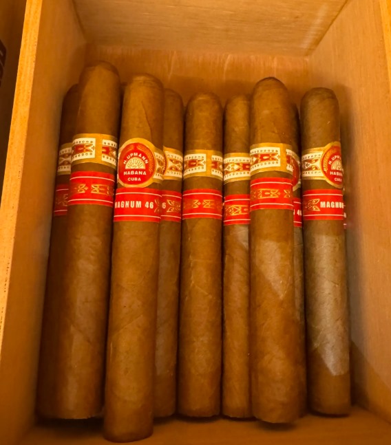今天开盒乌普曼玛瑙46,这款环径46的古巴雪茄在茄友圈里口碑两极。一盒25支要价8650元,单支346元,尺寸143mm×环径46,拿在手里分量感正好。马杜罗茄衣油光发亮,看着就诱人,但新茄的风味缺陷确实需要耐心陈化。
