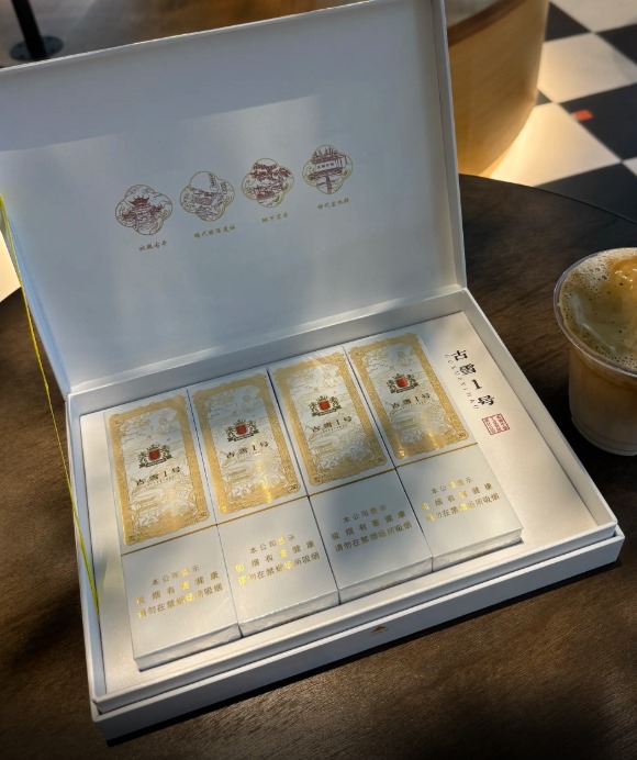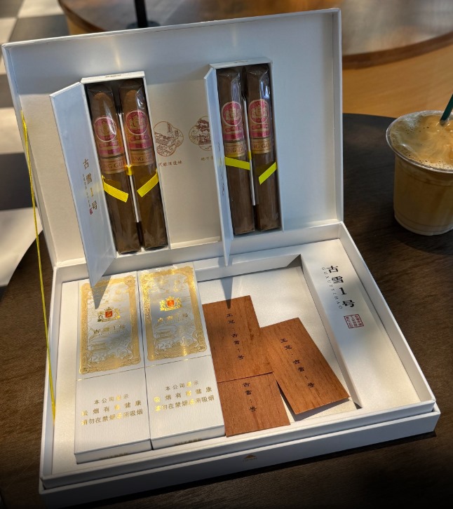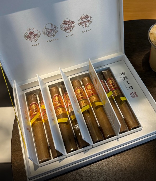 王冠古雪1号雪茄茄衣色泽均匀,采用多米尼加烟叶配方。外盒使用白金配色礼盒,正面印有“古雪1号”字样及徽派建筑元素,侧面标注与古井贡酒联名信息。内盒为独立铝管包装,并配备雪茄剪和便携盒,具有较强的收藏与实用价值。