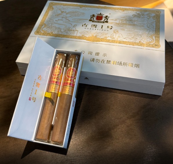 王冠古雪1号雪茄由安徽中烟与古井贡酒联合研发,规格为8支/包(2*4),售价640元/包。其为加长罗布图支型,长度140mm,环径50,燃烧时长约60-75分钟,浓郁度约为3星,定位于国产中高端雪茄产品。