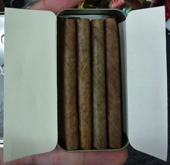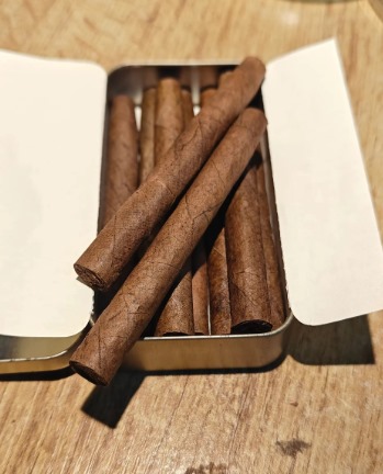 单支雪茄长度约75mm,环径较细,茄衣颜色偏深,表面光滑。茄帽剪裁整齐,卷制工艺扎实。未点燃时,可以闻到浓郁的咖啡香气,混合着淡淡烟草本香。