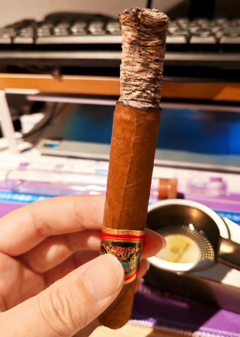 中段:燃烧状态很不错,卷工水平体现出来了,不过持灰能力一般。香气转向以烤甜香为主,能感受到咖啡和坚果的味道交织在一起。我抽得比较快的时候,舌尖会有点微微的辣感。