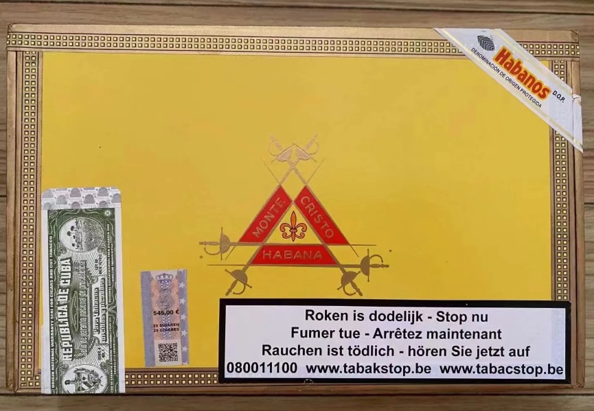 先说说它的样子。蒙特2号的包装盒挺有辨识度的,主色调是黄色,配着红色和金色的交叉剑LOGO,看起来简约又有点贵气。常见的是10支或25支的木盒,木盒对保湿和长期存放比较友好。也有一种15支的软纸盒装,里面分成了5个小纸板包。
