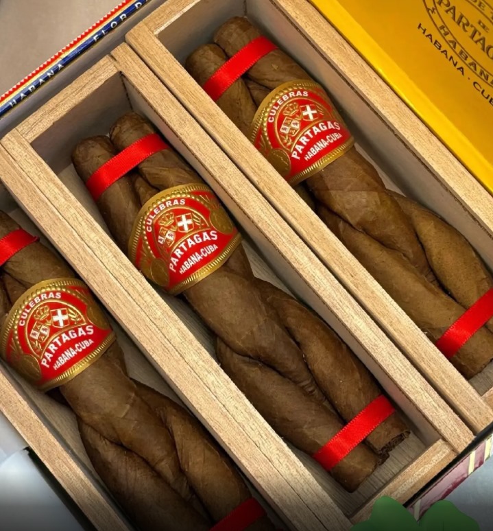 这造型绝了——三支深棕色雪茄像编辫子似的扭在一起,两头用红丝带扎着。茄衣油亮亮的,金色镶红五星的茄标特别扎眼。木盒是抽盖式的,打开还有股雪松木香,仪式感拉满。