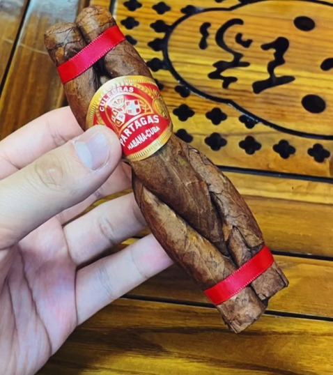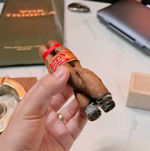 这造型可不光为了炫技——三支缠一起能促进发酵。早期是防工人偷茄的招儿,现在成了特色。茄芯混了Vuelta Abajo产区的叶子,但工人会塞碎叶助燃,所以燃烧稳定性一般。