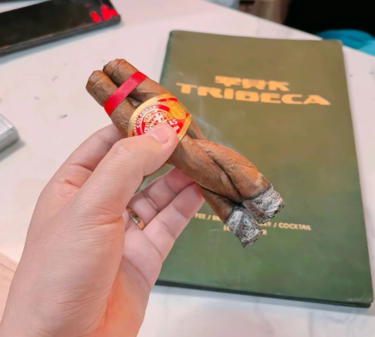 剪开红丝带抽出一支,点火头几口吸阻特小。味道主要是雪松木香,混着淡淡烤土司味和香草气。烟气比普通圆柱茄松散,入口柔和,但老饕可能觉得"空",不够带劲。