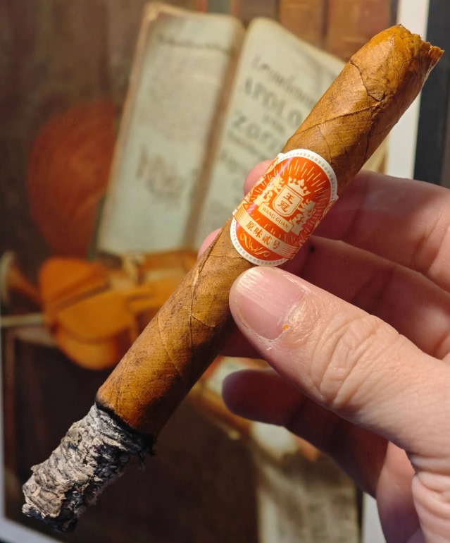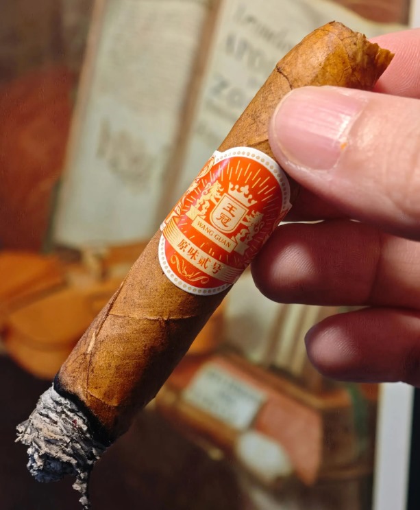 王冠原味二号的茄衣采用印尼苏门答腊阴植烟叶,叶脉较粗,色泽棕黄,但部分批次可能因原料差异呈现不同质感。工艺上是半叶式卷制结构,切口平整度较好,但烟灰松散易脱落,属于机制茄的常见特点。整体外观朴素,没有锡箔纸包装,茄标简约,尾端开口设计无需剪切口,便于携带。我觉得它的外观比较普通,符合低价定位。