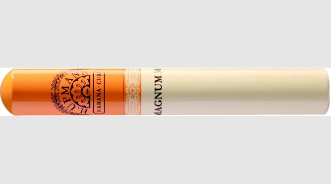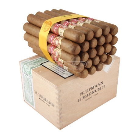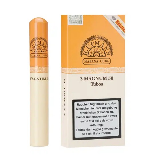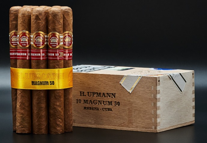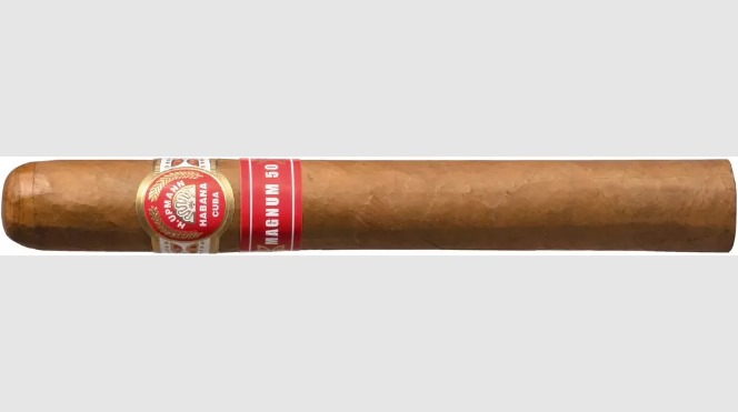 包装是深棕色木盒,盒盖印有金色“Magnum 50”标识,部分批次配铝管包装保湿。茄衣油亮光滑,深棕色或栗色,纹理细腻,茄身粗壮饱满,茄帽圆润。烟灰灰白色,持灰性好,燃烧均匀,吸阻适中。