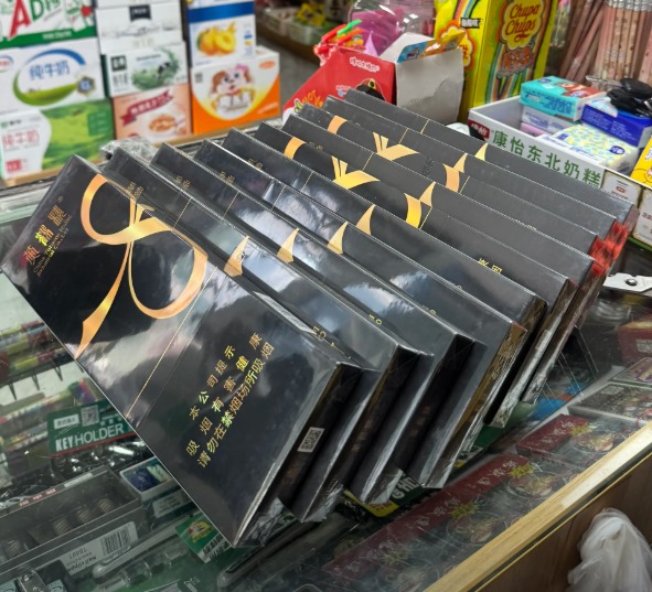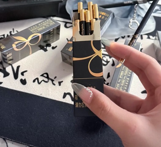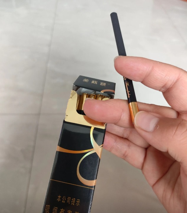黄鹤楼冰咖香烟采用纯黑色包装,搭配鎏金品牌标识,整体设计带有现代感。盒面附有菱形镭射防伪标,光线下会产生多维折射效果。Logo使用立体烫金工艺,结合传统书法与几何边框设计。单支装则采用磁吸式铝管封装,便于防潮与携带。