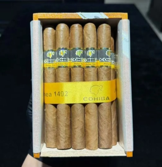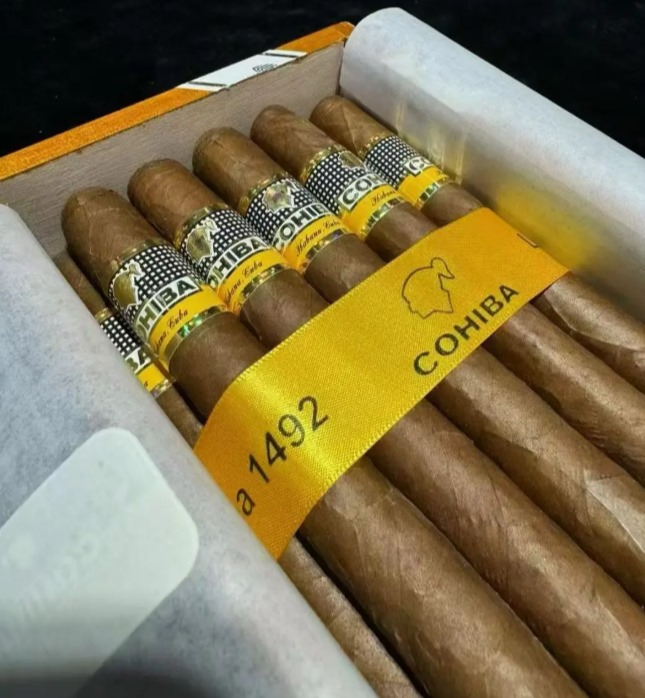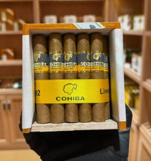 国行版本包装以黄色为主色调,配黑色标识,有25支普通装和15支铝管装。铝管设计有助于保湿和便携。茄衣呈深棕色,表面光滑油润,茄帽为三线帽设计,茄身紧实有弹性。防伪方面,茄标有全息泰诺印第安人头像,边缘重复COHIBA字样,紫光灯下可见防伪点。点燃前能闻到雪松、坚果和轻微胡椒香。