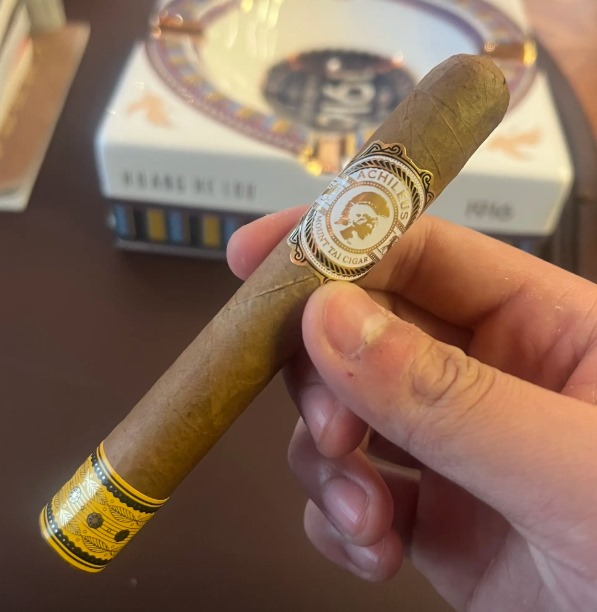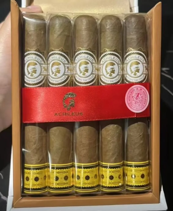 外盒采用白金配色,设计为对角线开启结构,搭配牛油纸与红丝带包装,具有较强的仪式感。盒面印有金色“战神”徽标,整体风格简约现代。雪茄单支为玻璃纸包装,茄标低调,仅标注品牌与型号。雪茄卷制紧实,茄体弹性适中,燃烧线较稳,烟灰呈灰白色且不易掉落。