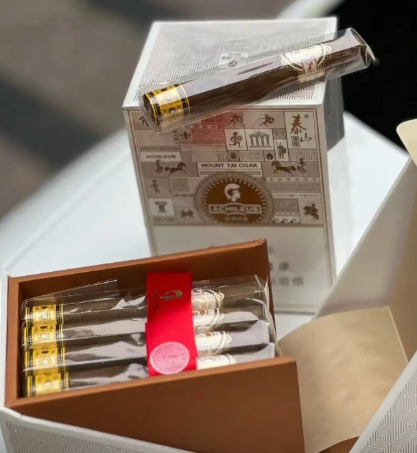 - 泰山巅峰5号(152mm×52):木香、坚果与咖啡风味,陈年烟叶更复杂,档次更高。