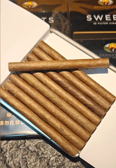 今天抽了支丹纳曼特甜干邑小雪茄,就是那种黑色金属盒装的机制茄,圈里叫它“甜点口粮”。一盒20支卖450元,算下来一支20多块,挺亲民。尺寸是92mm长,环径20,属于Cigarillo型号,浓郁度大概1星半,适合短时间解瘾。我这盒养了几天,茄衣看着油润润的,直接开搞!