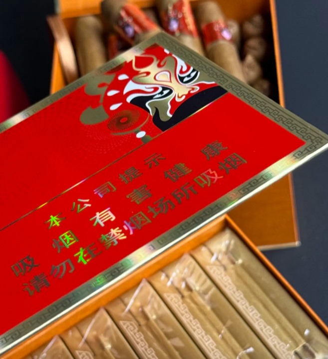 - 包装:中国红为主色调的铁盒包装,配京剧脸谱图案,单盒5支,每支独立玻璃纸封装